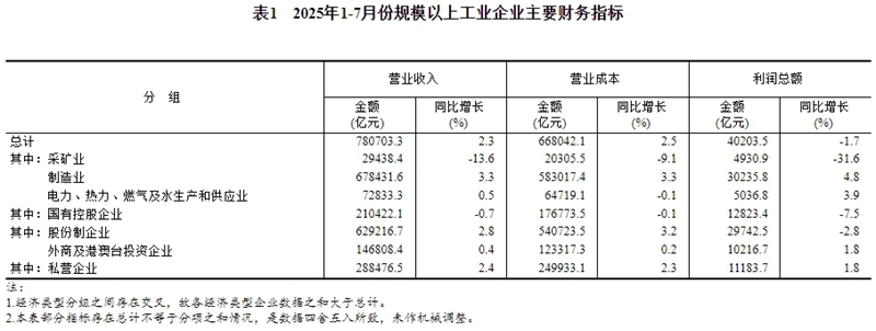 1—7月份,全國規模以上工業(yè)企業(yè)實(shí)現利潤總額40203.5億元,同比下降1.7%(按可比口徑計算,詳見(jiàn)附注二)。